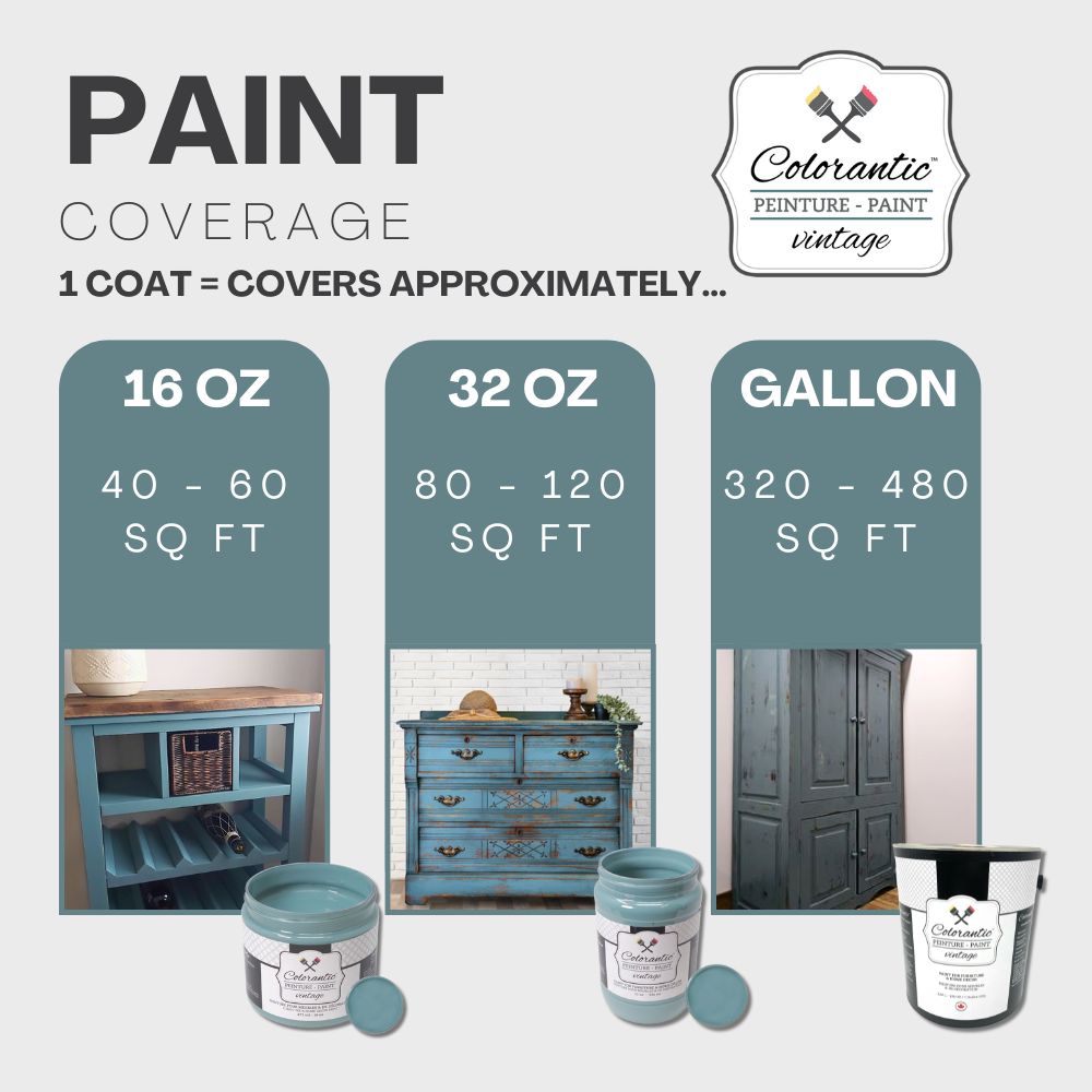 Coverage: 8 oz: 20-30 square feet, 16 oz: 40-60 square feet, 32 oz (Quart): 80-120 square feet, Gallon 320-480 square feet